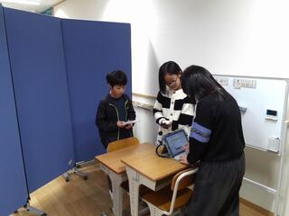 暖かく快適な住まい方を考えました。その後、班で決めた校内のいろいろな場所の温度・湿度・照度を調べました。調べてみて、教室や校内は快適に過ごせる環境になっていることや、暖房以外にも暖かくすることができると気づきました。生活の中で活かしてほしいと思います。