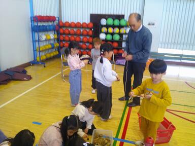 1年生は、生活科「ふゆとなかよし」の一環で、地域の方から昔遊びを教わりました。普段は使わないおもちゃに、みんな興味津々です。