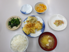 ごはん、みそ汁、コロッケ、ぎょうざ、ほうれん草のおひたし、フルーツポンチでした。