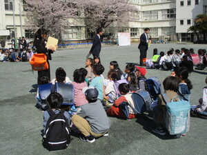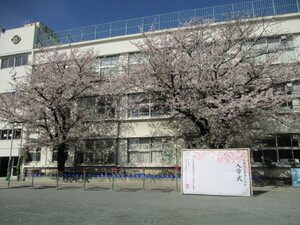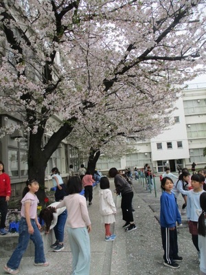 桜も満開です。PTAの方々が、入学式用の