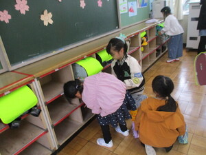 新しい教室で、ランドセルをロッカーの所