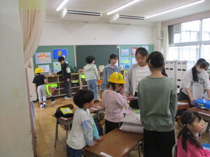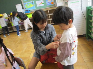 教室で名札をつけてもらっています。登下校