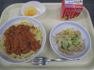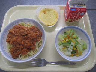 スパゲッティ大豆入りミートソース 牛乳 パリパリサラダ