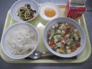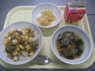 麻婆豆腐丼 牛乳 春雨スープ