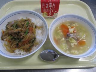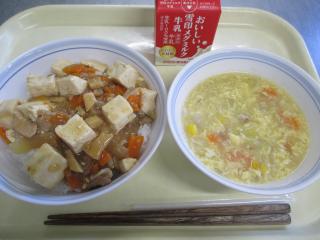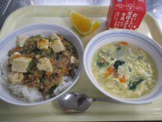 麻婆豆腐丼 卵スープ ジューシーフルーツ 牛乳