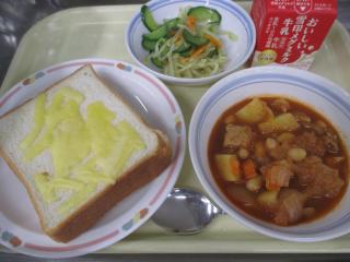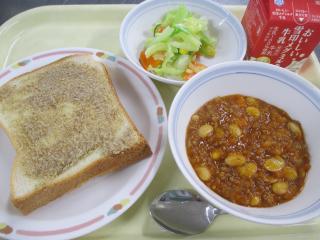 チーズトースト ポークビーンズ もやしのカレー風味 牛乳