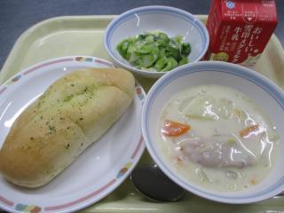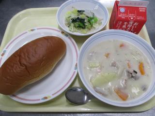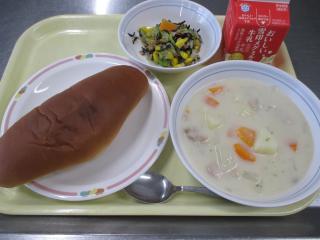 レーズンパン 米粉のクリームシチュー ひじきとコーンのサラダ 牛乳