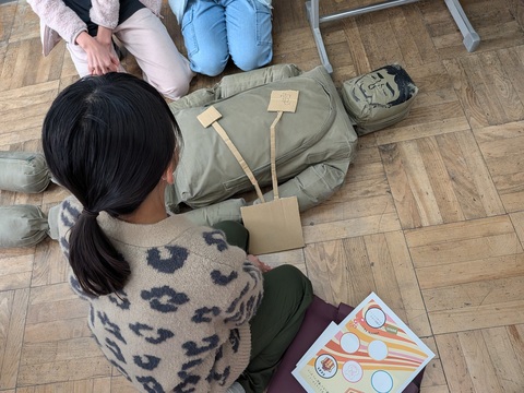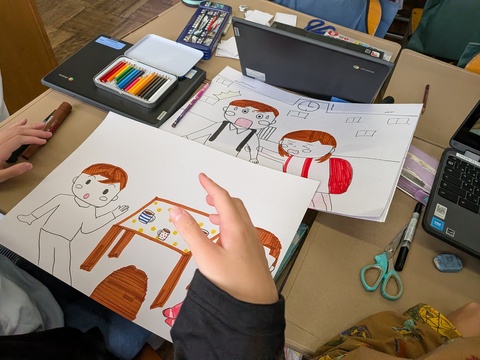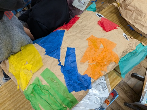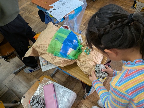 さて、2年生の図工の時間。大きな袋に絵をかいてから詰め物をして、大きな立体を作っていました。私のお友達というタイトルがついており、なんとなく抱き枕のような感じです。お気に入りの顔を描いたり、飾り付けをしたりして思い思いの友達を作っていました。