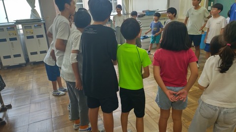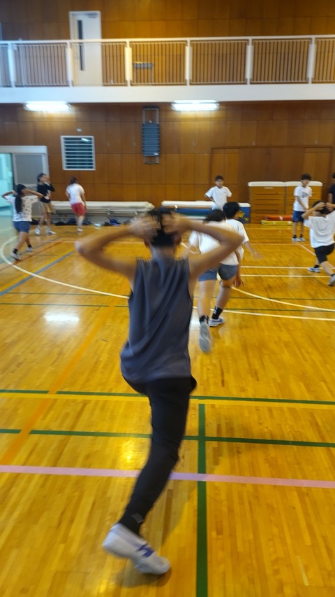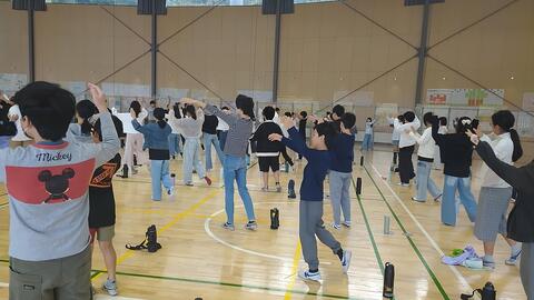 体育館で新しい振りの説明を聞き、今までに教わった振りとつなげて踊ってみました。