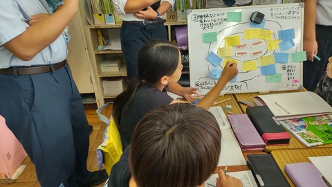他のグループからもらった付箋を確認するときの子どもたちの表情は「どんなことを伝えてもらえるんだろう」という期待の表情に満ちていました。他者からの意見をもとにプロジェクトをブラッシュアップしていきます。この学習は、対象を定めて自分たちが役に立つ、力になるという気持ちがモチベーションになっています。誰かのために頑張るという社会の形成者としての資質を育み、未来を切り拓く力を養う取り組みです。