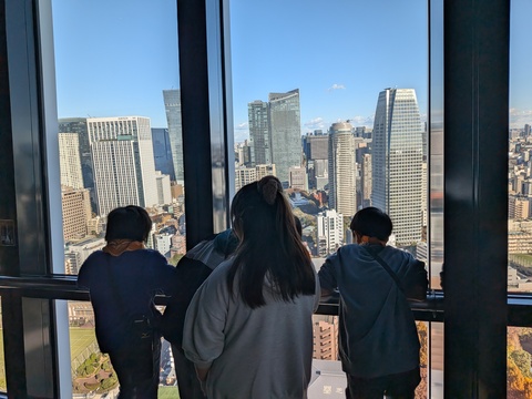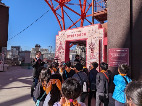 東京タワーでは、約600段の階段を上って第一展望台へ。先頭は5分弱で到着しました。展望台では360度に広がる東京の街並みを眺めました。東京湾、スカイツリーもよく見えました。遠くには富士山も見えました。冬は空気が澄んでいるのでかなり遠くまで見ることができます。