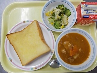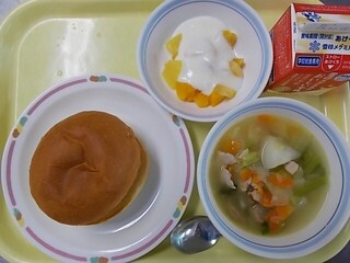 焼きカレーパン 牛乳 かぶ入り野菜スープ ヨーグルトあえ