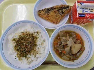 胚芽ごはん 大豆のカリカリふりかけ 牛乳 さばの香味揚げ 芋煮
