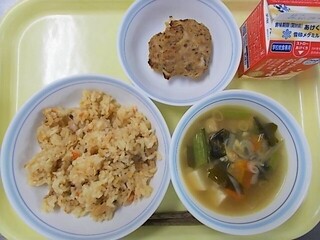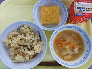 かやくごはん 牛乳 切干大根の卵焼き かす汁