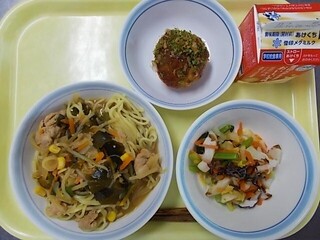 みそラーメン 牛乳 白菜とちくわの塩昆布サラダ たこ焼きポテト