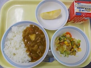 冬野菜のカレーライス 牛乳 ビーンズサラダ りんご