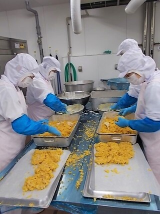 蒸してつぶしたさつまいもにバターや生クリームなどを入れて、なめらかな食感になるように丁寧に混ぜていきます。