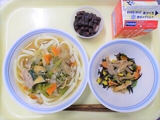 七草うどん 牛乳 バランスサラダ 白玉ぜんざい