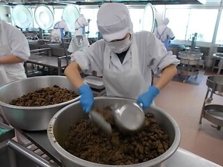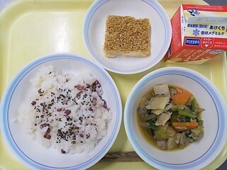 あずきごはん 牛乳 松風焼き 豚肉と根菜の煮物