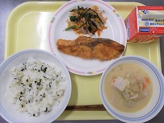 わかめごはん 牛乳 ぶりの竜田揚げ 磯和え 呉汁