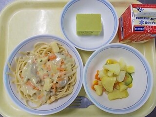 シーフードクリームスパゲッティ 牛乳 おさつポテトサラダ あしたば米粉ケーキ