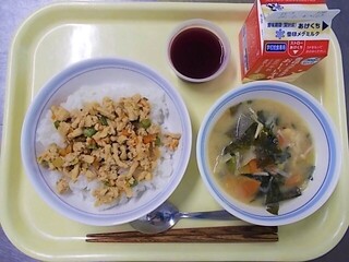 高野豆腐のそぼろ丼 牛乳 ほうれん草のごまみそ汁 ぶどうゼリー