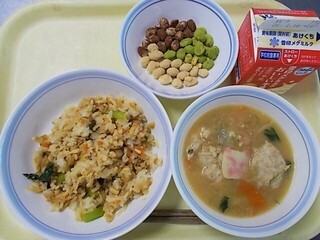 五目ごはん 牛乳 つみれ汁 3色福豆