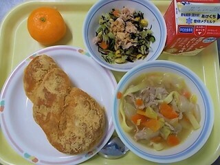 きなこ揚げパン 牛乳 ヌードルスープ まめツナサラダ みかん