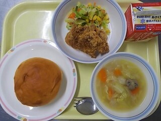 チーズパン 牛乳 ミラノ風カツレツ コーンサラダ 野菜スープ