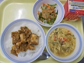 家常豆腐丼 牛乳 中華風ごまサラダ めかたまスープ