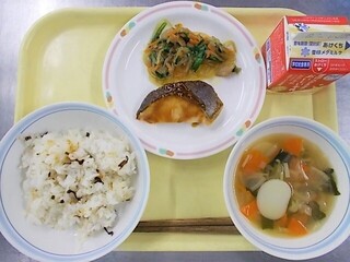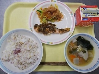 ゆかりごはん 牛乳 鮭のふきみそ焼き おかか和え のっぺい汁
