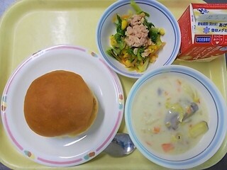 手作りあんぱん 牛乳 菜の花の和風サラダ 白菜とさつまいものクリーム煮