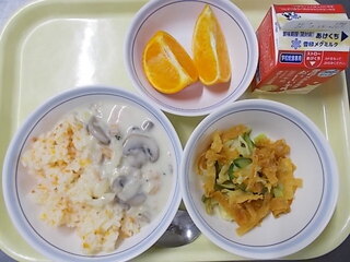 キャロットライスのクリームソースかけ 牛乳 パリパリサラダ