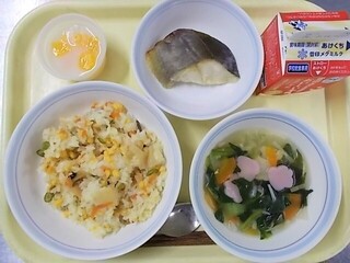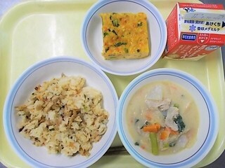 たこめし 牛乳 菜の花の卵焼き 呉汁
