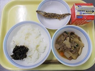 胚芽ごはん のりの佃煮 牛乳 ししゃもの南部焼き 芋煮