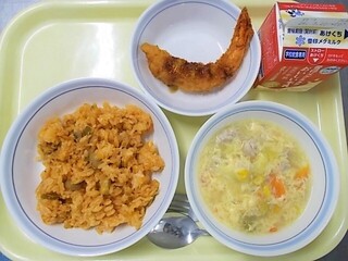 チキンライス 牛乳 えびフライ 春キャベツの卵スープ