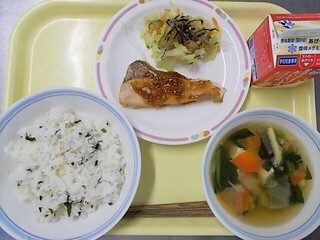 わかめごはん 牛乳 魚のごまあんかけ 糸寒天とキャベツの和え物 けんちん汁
