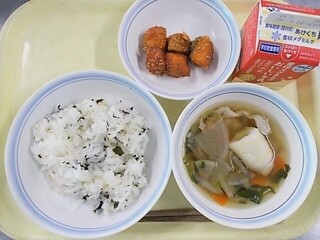 ちりめんごはん 牛乳 鮭のあずま煮 きりたんぽ鍋