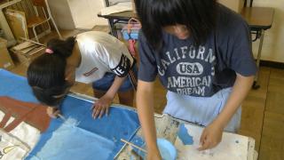 毎朝、時間になると図工室に集合。鉛筆で下書きをした上から、アクリル絵の具を塗ります。