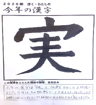 毎年高学年になると「今年を漢字1文字で表すと・・・」というお題に沿って習字を行っています。今年は、来年に向けての抱負を漢字1文字で表してもらいました。令和の2年目、第100回卒業式、中学校生活、オリンピックなど様々な行事が控えています。書いた文字通り、豊かな・実りある1年となるように願っています。