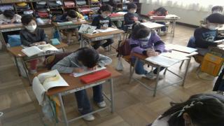 国語では、『たぬきの糸車』というお話を読んでいます。今日は、たぬきがうれしそうに帰っていく場面を読みました。「たぬきはどんな気持ちだったのかな。」という課題に向かって、みんなで話し合い、ワークシートに考えを書きました。 3学期に入り、自分が思ったことを文章にし、正しくつづることができるようになりました。