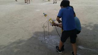 科学クラブのペットボトルロケットの様子です。どのロケットもかなり飛んでいました。