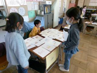 国語「ものの名まえ」の学習で、お店屋さんごっこをしました。「いらっしゃいませ。」「ケーキを1つください。」など、お店屋さんやお客さんのやりとりを楽しみながら商品を売買しました。
