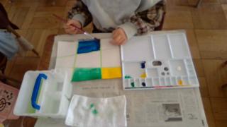 図工の学習で、絵の具の使い方を学習しました。小学校で初めての絵の具の学習でしたので、筆やパレット、ひっせん(バケツ)などの道具の置き方から学習を始めました。画用紙にクーピーで線を引いて、その中を絵の具で塗っていきましたが、どの子も直線や波線、点など、様々な模様を楽しく描いていました。今回の学習を基に、次は、「せかいでいっぴきカラフルかたつむり」を描いていきます。どんなかたつむりになるか、ぜひお楽しみに!