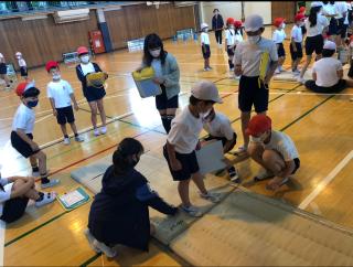 本日、1年生の体力テストのお手伝いをしました。今日測定した種目は、ソフトボール投げ、立ち幅跳び、上体起こし、反復横跳びです。やにしタイムのペア同士で行動しました。1年生にやり方を優しく教えてあげたり、励ましながら測定を手伝ったりする姿が多く見られました。下学年と交流を行っている時の6年生の背中は、いつも以上にとても頼もしく見えます。6年生の皆さん、よく頑張りました!