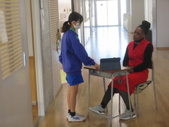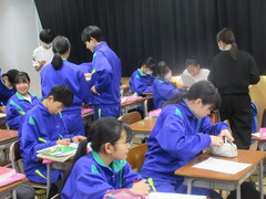 学級弁論大会に向けて準備をしています。先生に原稿を確認してもらいながら