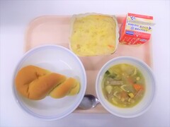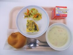 メニューは、ミルクパン、ポテトオムレツ、キャベツと小松菜のレモンマリネ、