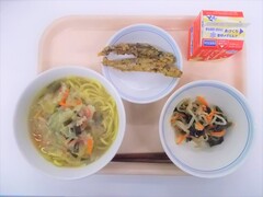 かつおと昆布が香るほこほこにゅうめん汁、牛乳です。