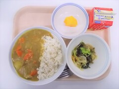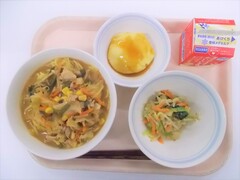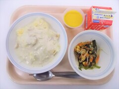 本日の給食は、キャロットライスのクリームソースがけ、コーンとわかめのサラダ、