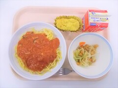 本日のメニューは、ミートソーススパゲッティ、わかめサラダ、